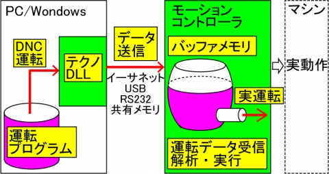 ①PC上の運転プログラム(G言語やテクノ言語)はテクノDLL経由でファインモーションのバッファメモリへ送られます。